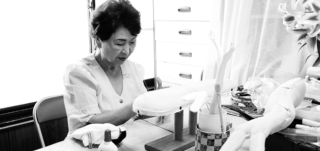 一体の人形を作るには「縫製・布を染める・刺繍・顔を描く」等、様々な技術と知識が必要で、福永さんはこれらの工程を全て一人でこなします。実は現代のいわゆる日本人形作りの中でこれは稀な事なのです。裏を反せば、全ての工程を高いレベルこなせる作家が極めて少なくなったという事なのですが…